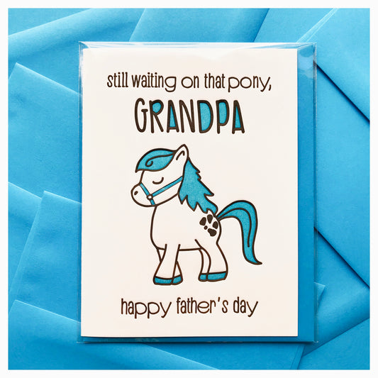 Funny Father's Day Grandpa Letterpress Card | Still Waiting on that Pony | kiss and punch